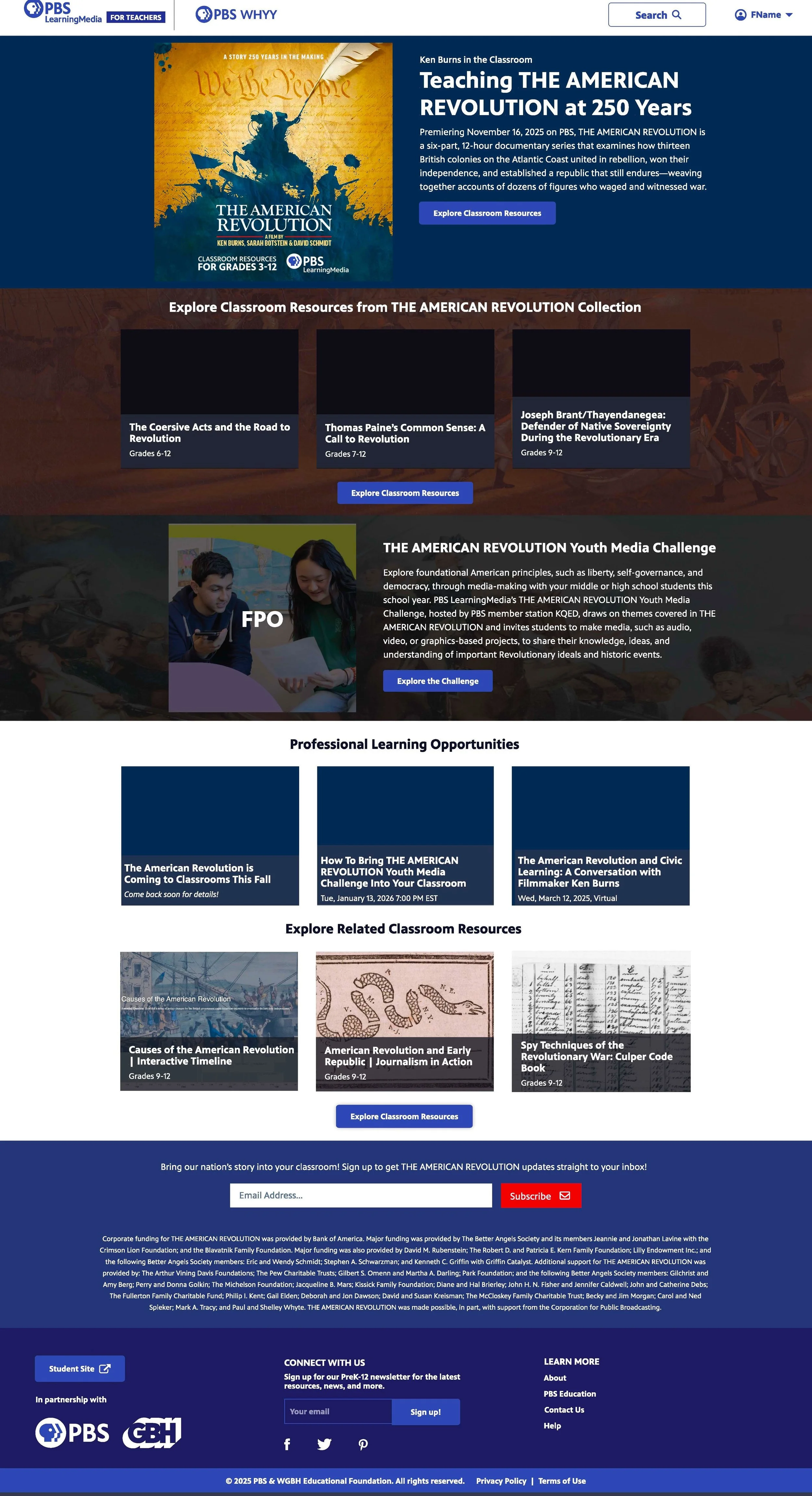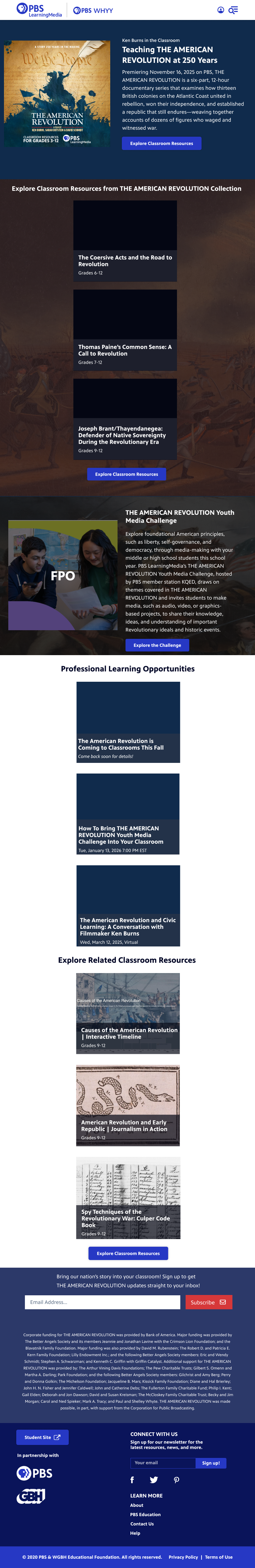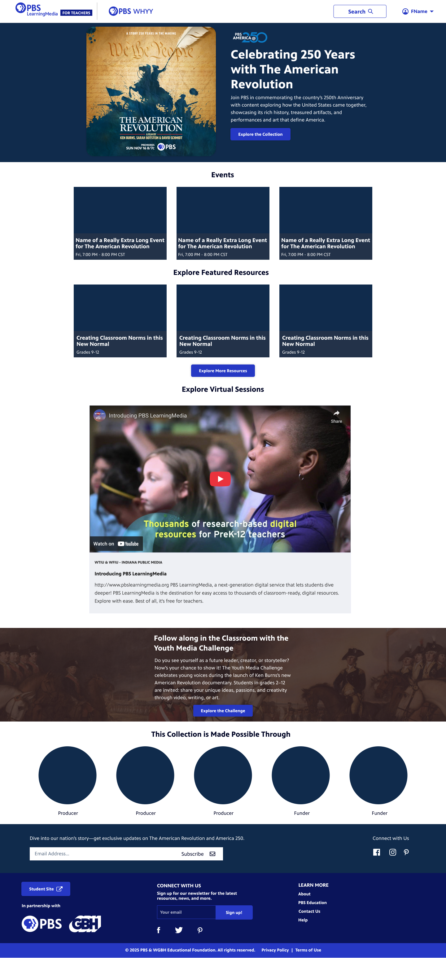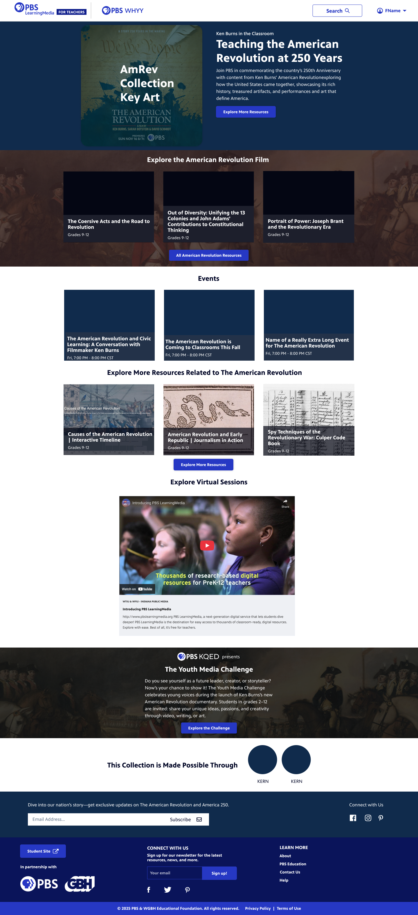 On November 16th, Ken Burns will be releasing a new documentary centering around The American Revolution in celebration of America’s semiquincentennial (250 years). In addition to a show page on PBS.org and a site for the film, we needed to create a hub page on PBS LearningMedia for educators to teach the American Revolution in the context of the film. We wanted the hub to visually feel similar to other promotional sites while also still feeling like part of the PBS LearningMedia brand.