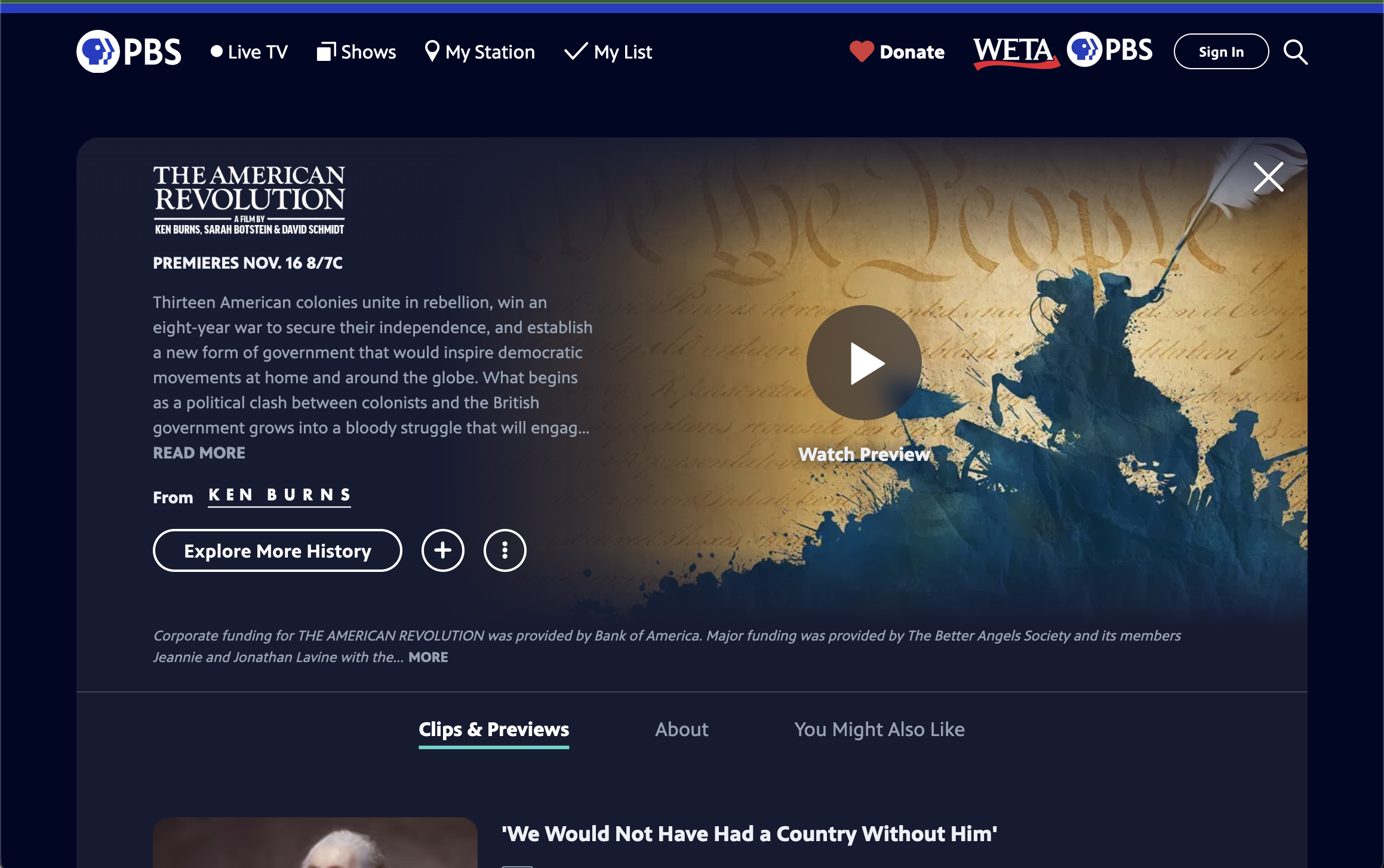 ”Join PBS in commemorating the country's 250th Anniversary with content from Ken Burns' American Revolution exploring how the United States came together, showcasing its rich history, treasured artifacts, and performances and art that define America.”