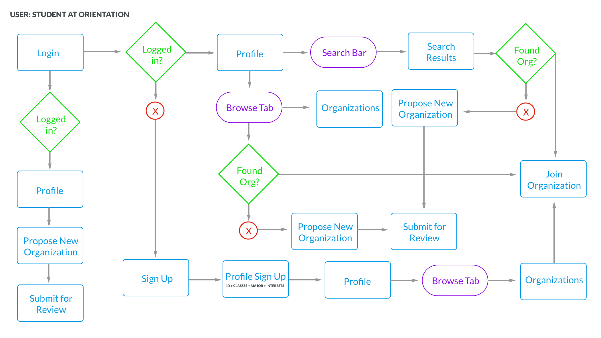 I started the process of creating a user flow with swim lanes to show the different functionalities of the end product. Any pain points with finding or browsing for organizations were reconciled with giving the student the ability to propose a new organization.
