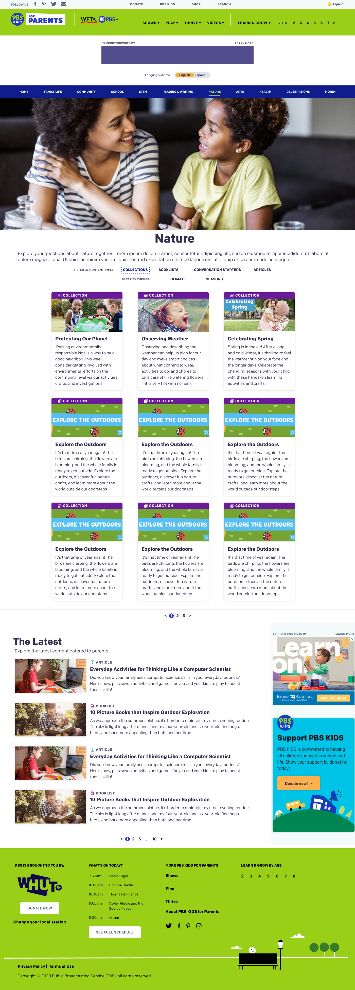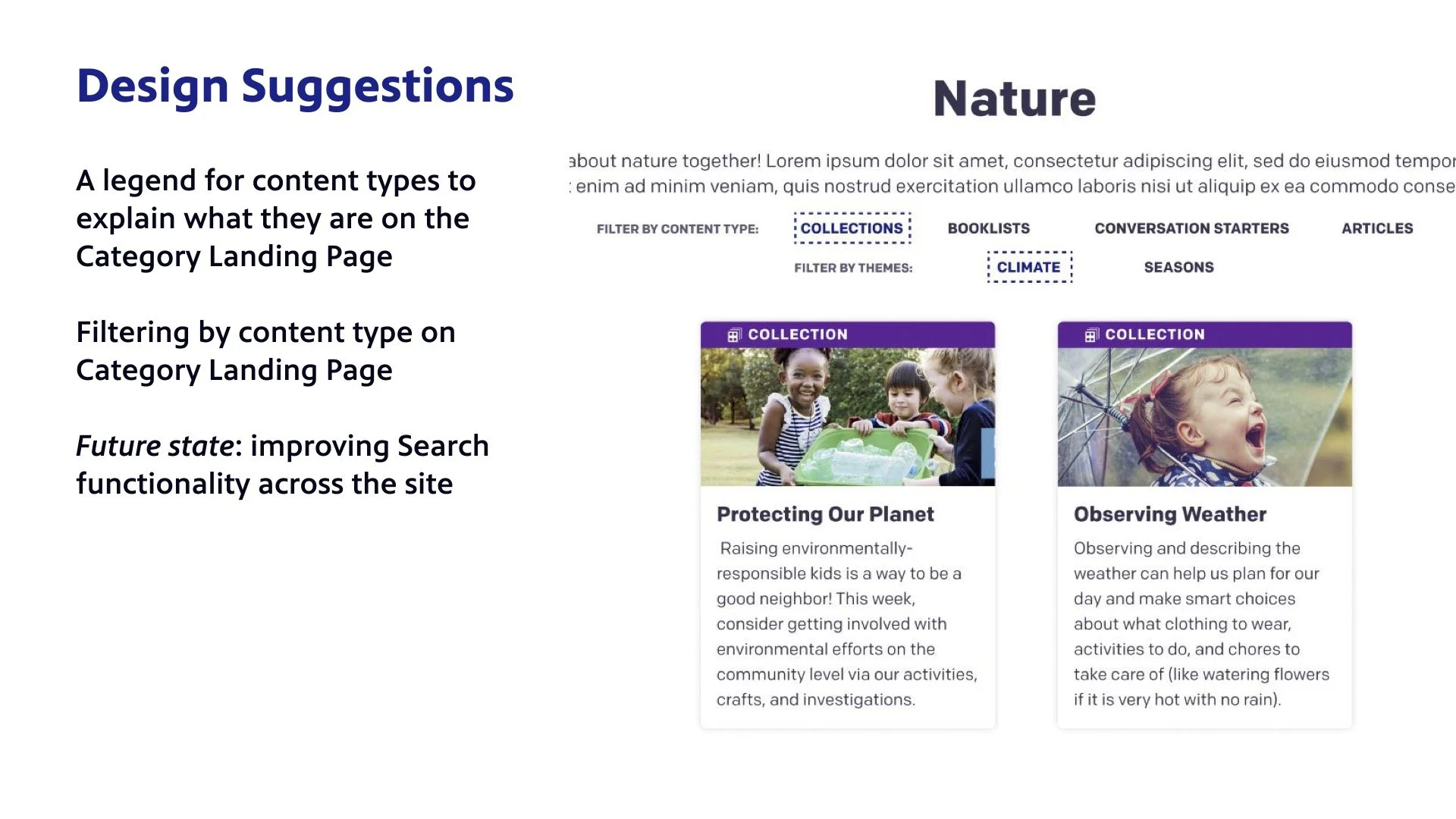 During a user study with an outside research firm, we learned that parents find a lot of value in our collections: bundles of content that include activities, articles, and interactive elements. We unfortunately had no direct way for parents to find this content type in a way that matched our current site architecture.