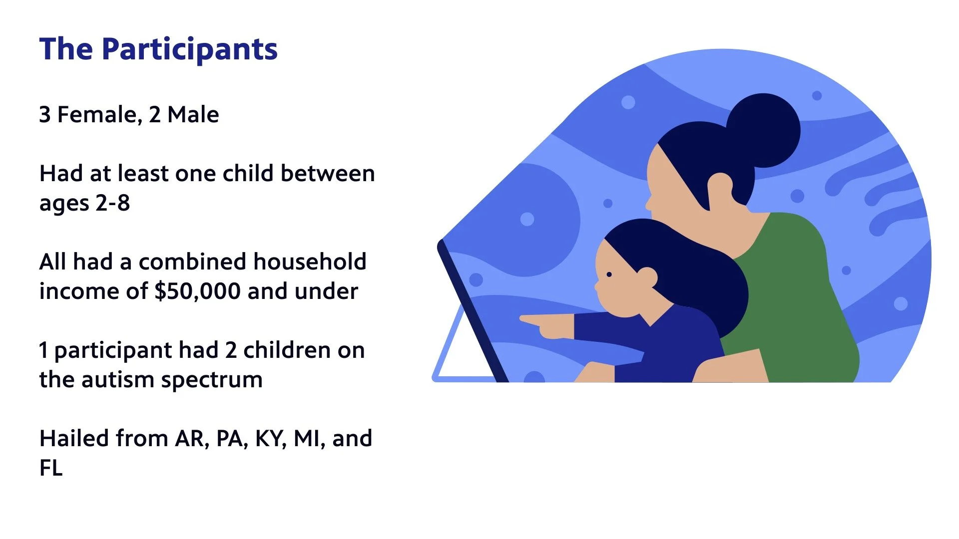 Using lean UX methodology, we recruited 5 participants to interview. To make our product as accessible as possible all participants were all low-income with one parent also having children on the autism spectrum.